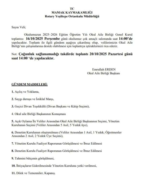 Okulumuzun 2025 2026 eğitim öğretim yılı Okul Aile Birliği Genel Kurul toplantısı 16 Ekim 2025 Perşembe günü Konferans Salonumuzda saat 14:00 da yapılacaktır. Gündem maddeleri aşağıda belirtilmiştir.